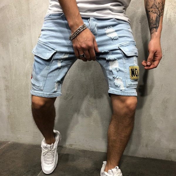 Verão novo dos homens estiramento em linha reta calças de brim curto moda casual fino ajuste de alta qualidade elástico distintivo bolsos buraco denim shorts masculinos